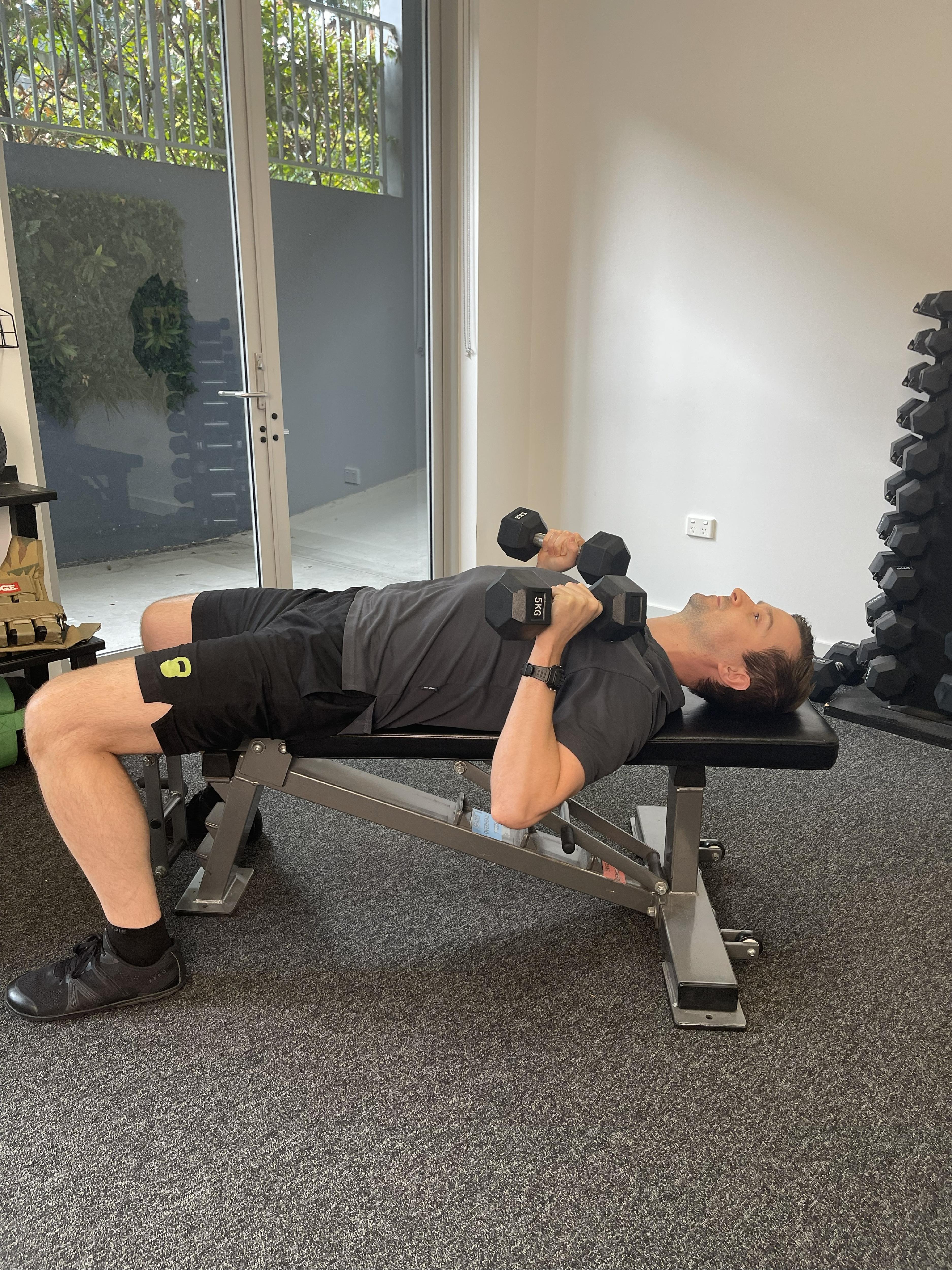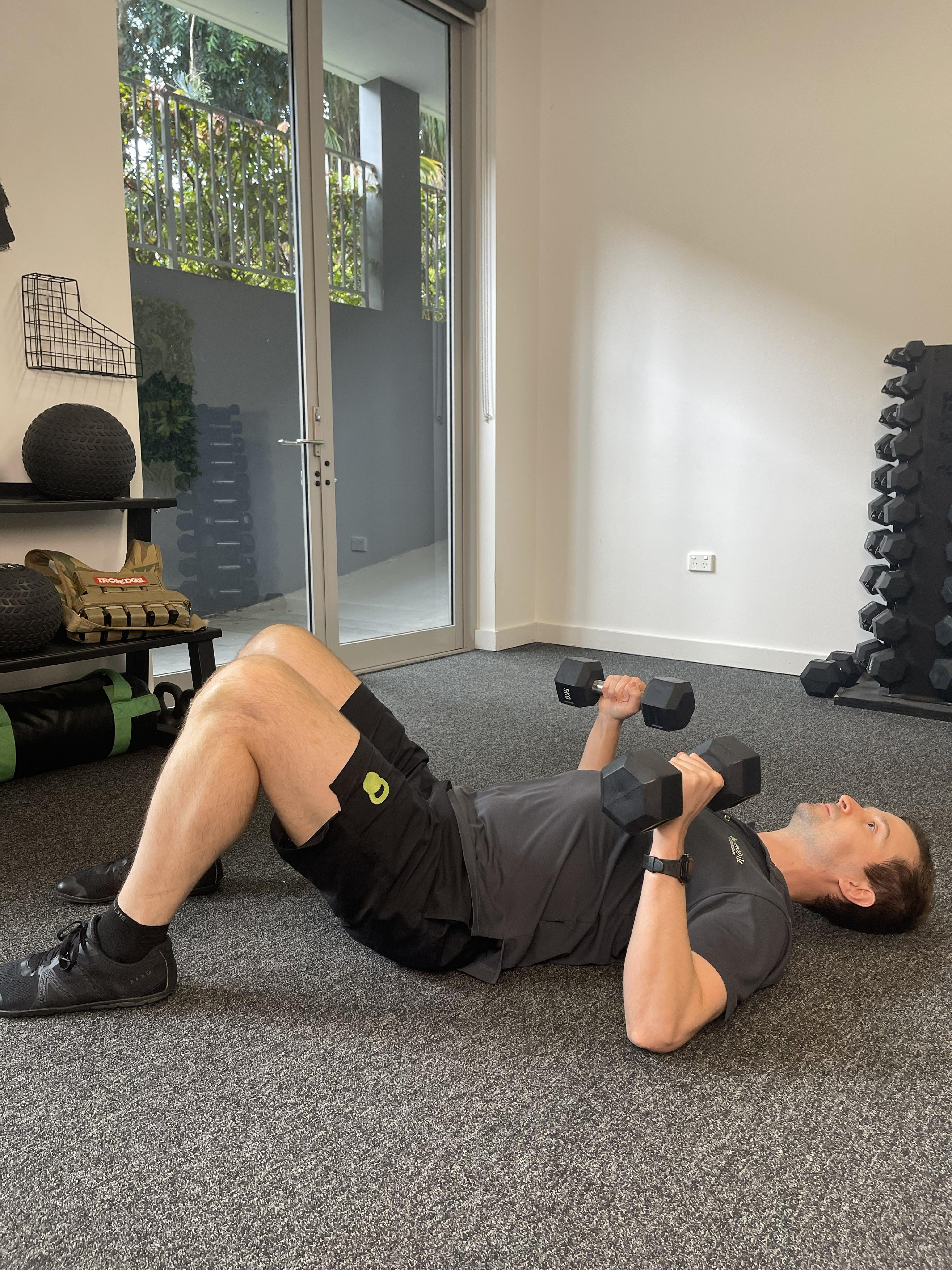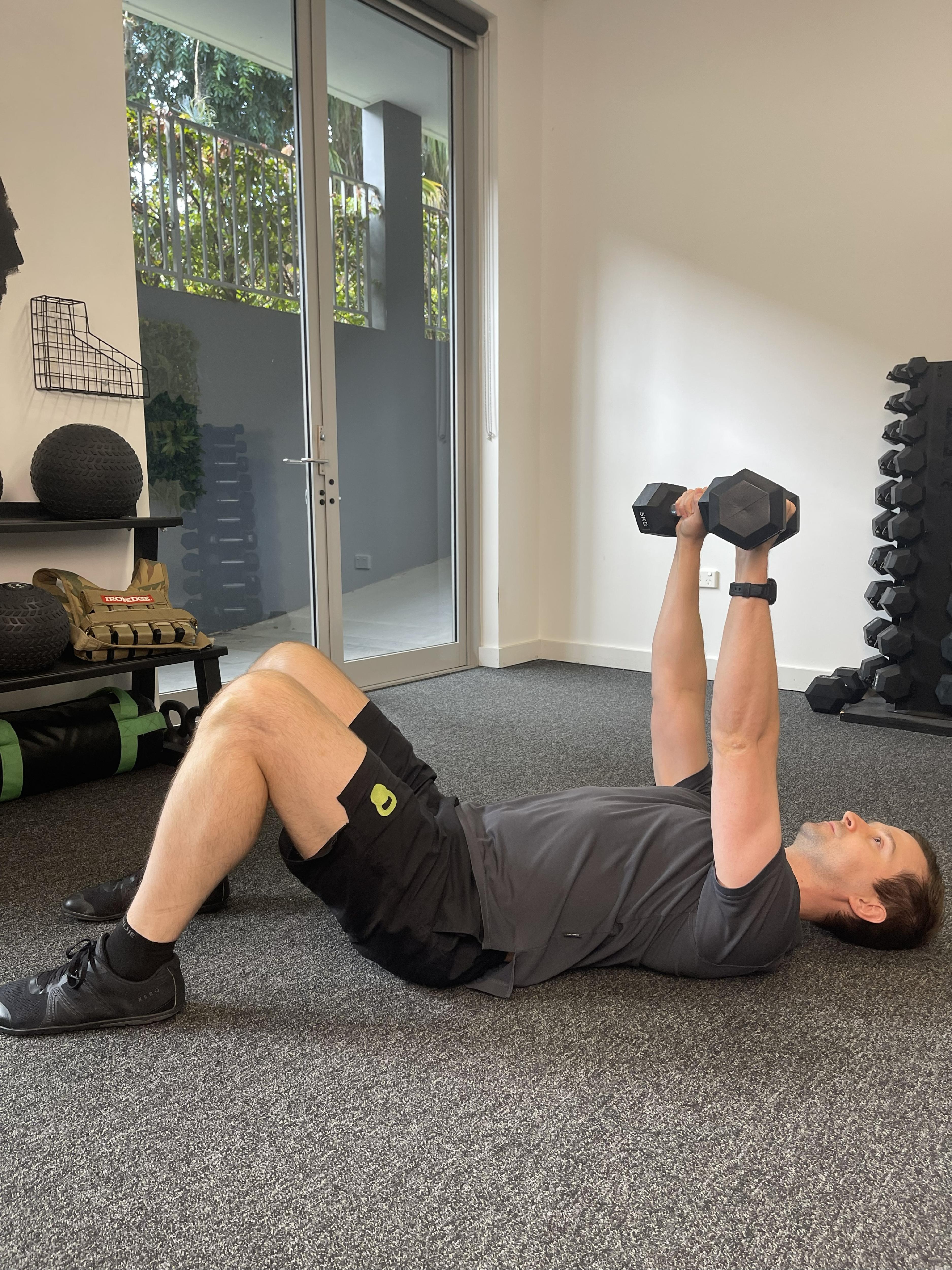 Don't have a bench? No problem. Lie on your back on the floor (or a bed/couch). Push the weight(s) up towards the ceiling. Your elbows will touch the floor at the bottom of the movement, that’s fine.
