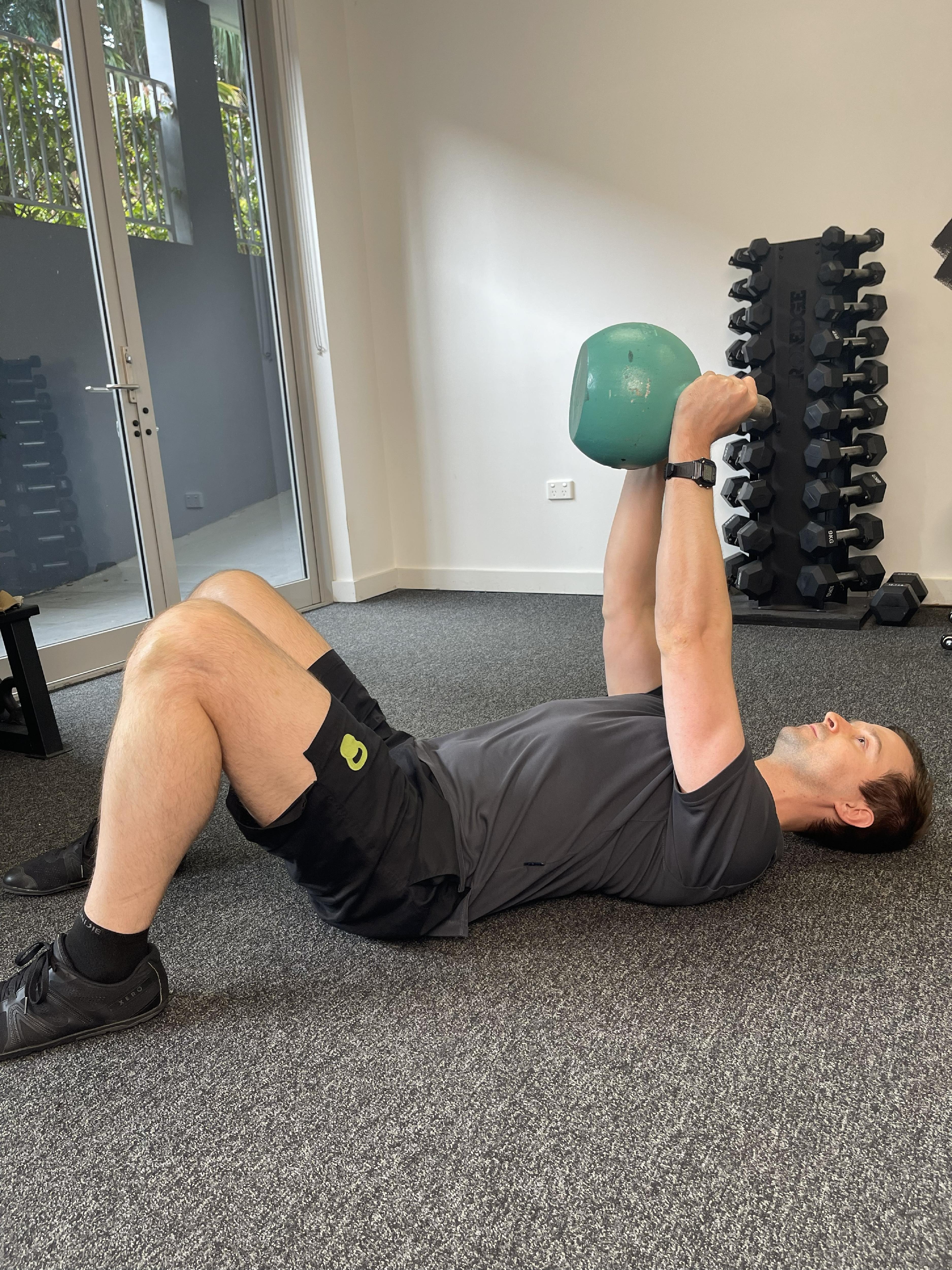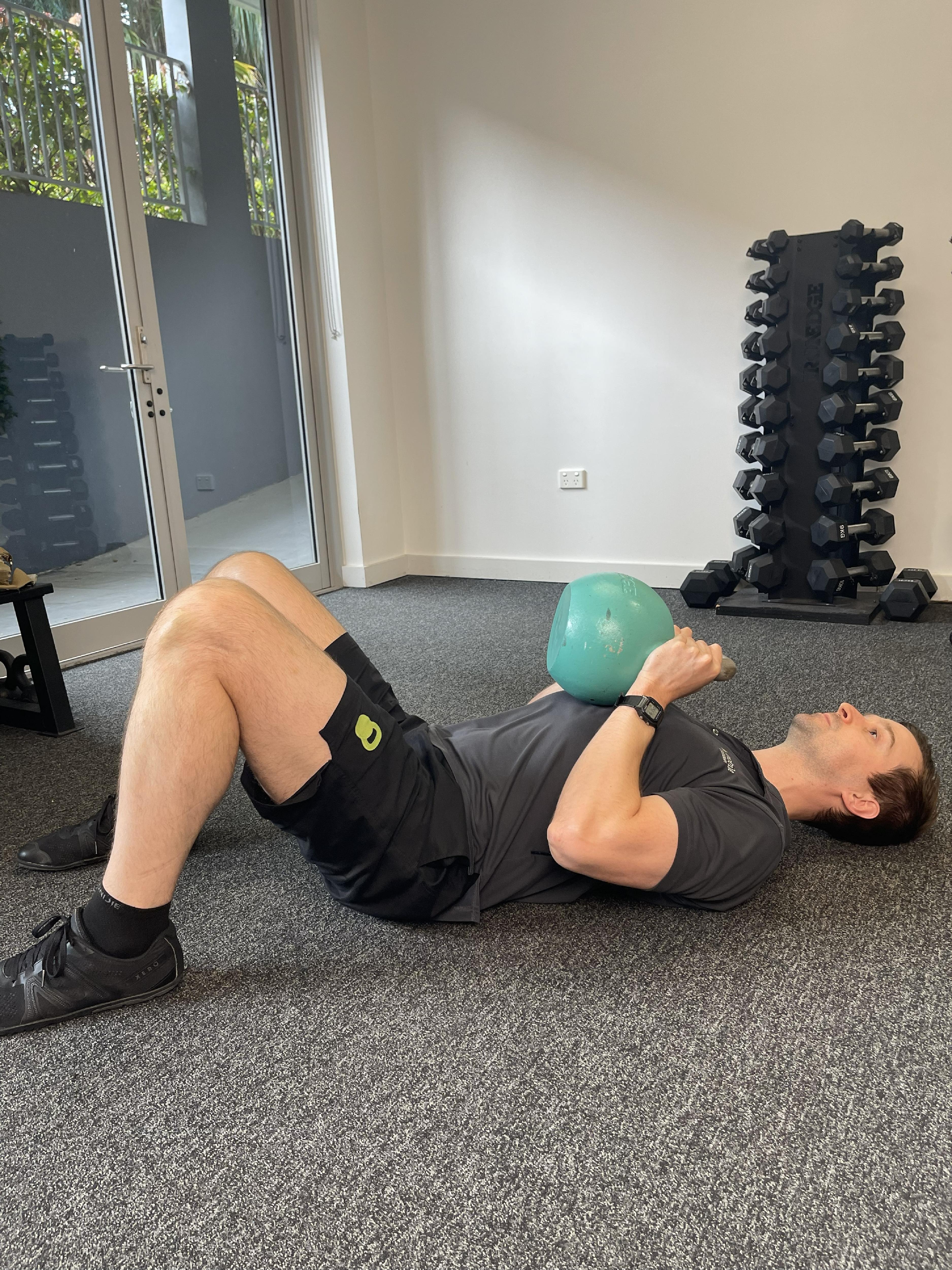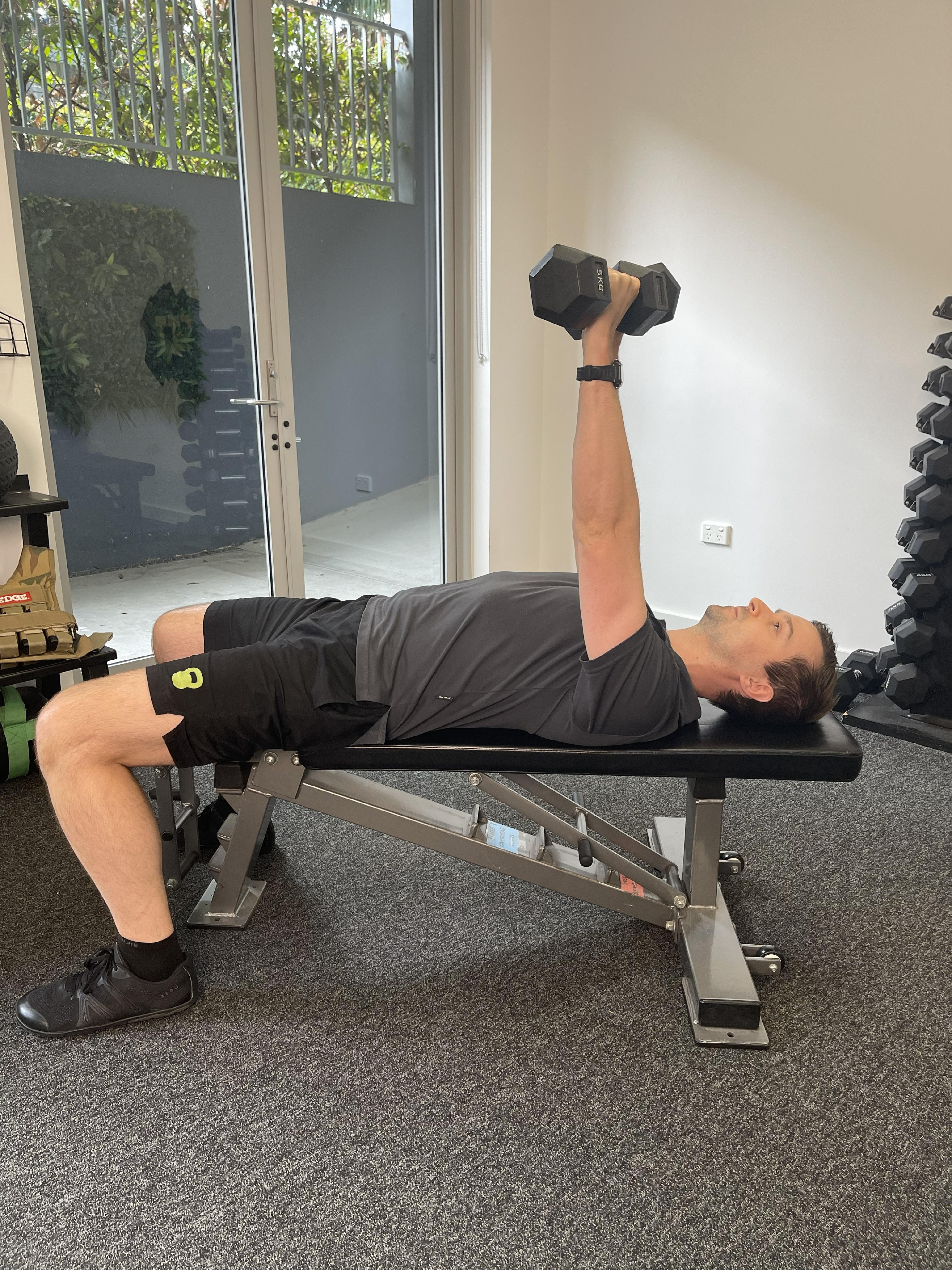 Don't have a bench? No problem. Lie on your back on the floor (or a bed/couch). Push the weight(s) up towards the ceiling. Your elbows will touch the floor at the bottom of the movement, that’s fine.