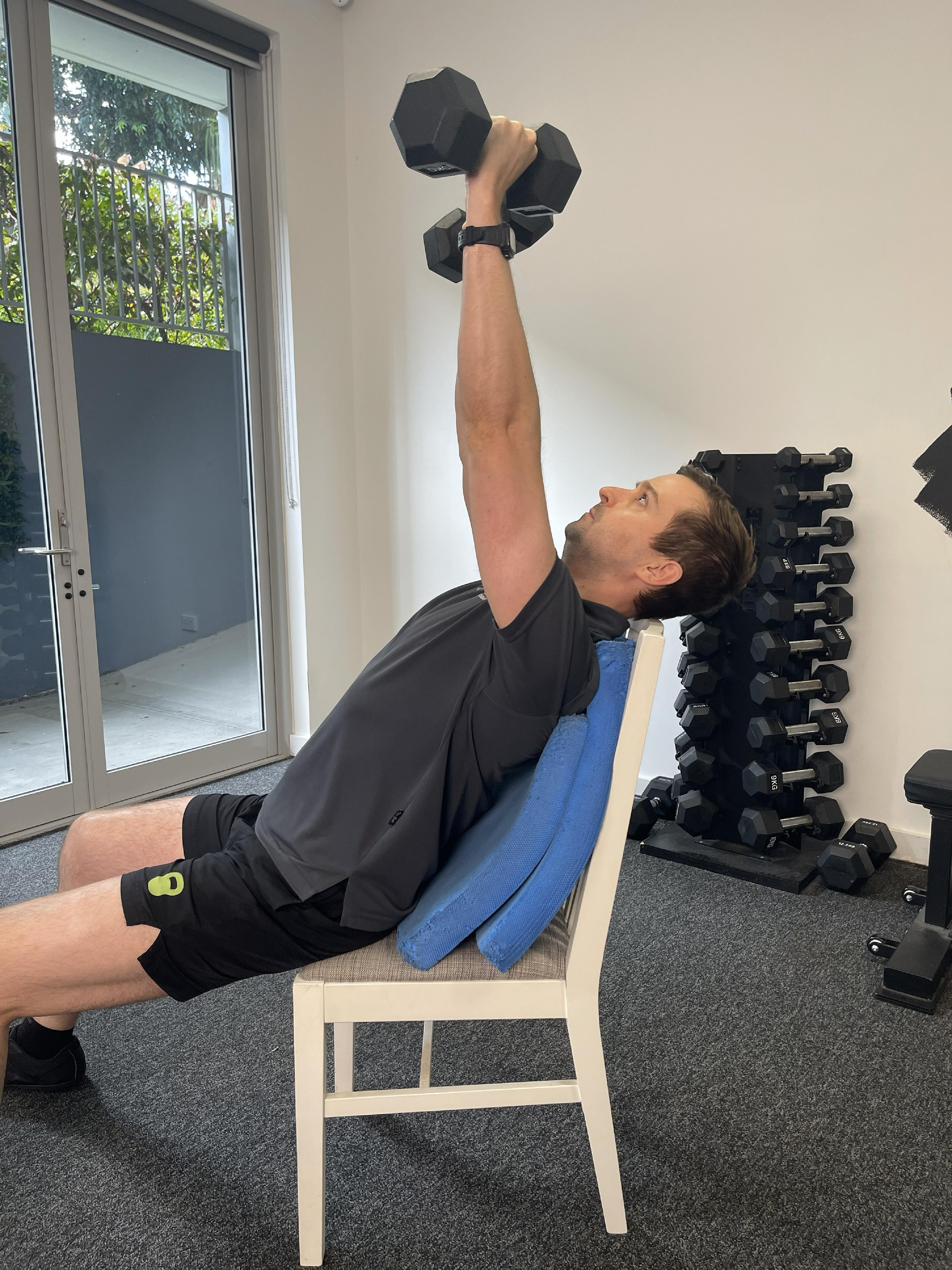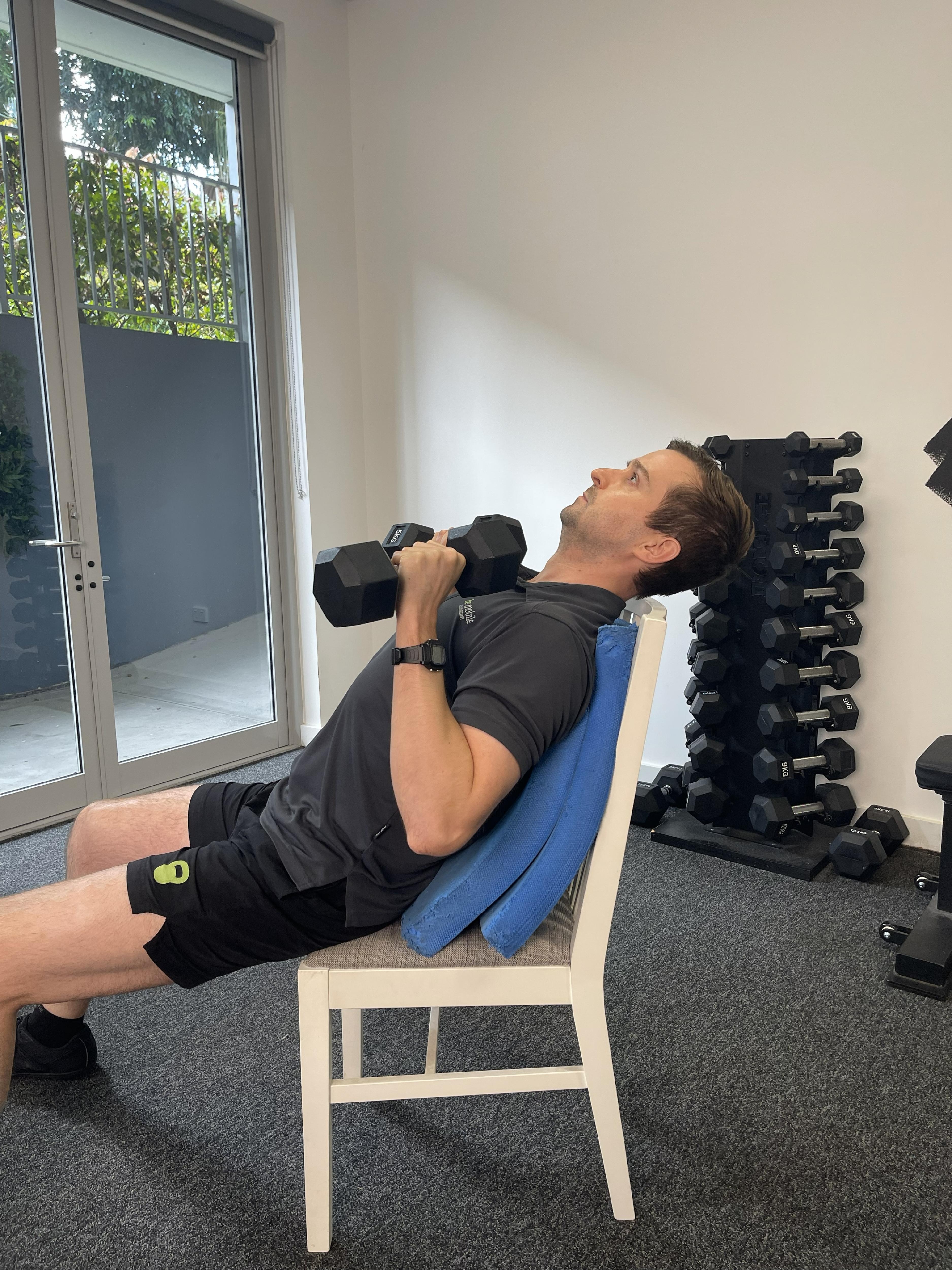 Sit on a couch/sofa or a sturdy chair and lean back as far as you comfortably can (using pillows for support if needed). Push the weight(s) straight up towards the ceiling. The further you lean back, the more this mimics a push-up motion. As you can see in the picture, it’s a bit tricky to do on a standard chair as you run out of room for your bottom, so a couch/sofa works best for this version. Once again you can use dumbbells in each hand, or a single heavy weight (e.g. kettlebell, bag) held with both hands.